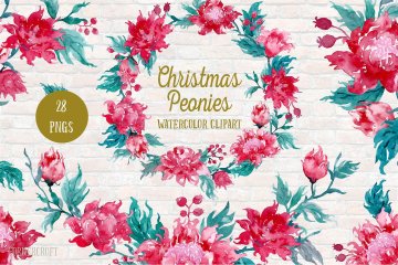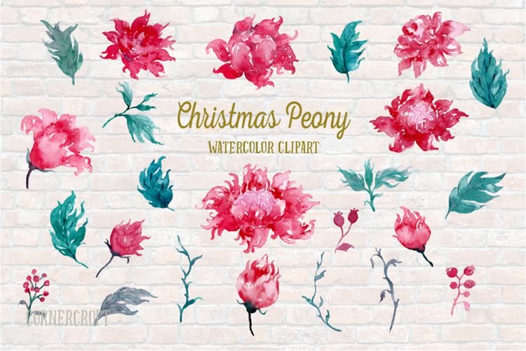 图穷联素材库 » 72手绘圣诞深红配色牡丹水彩剪贴画 Watercolor C