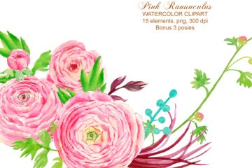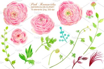 手绘水彩粉红色毛茛插画设计素材 Watercolor Cli