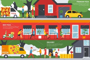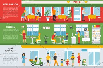 图穷联素材库 » 外卖披萨餐厅内部展示服务概念平面插图 Pizzeria Fl