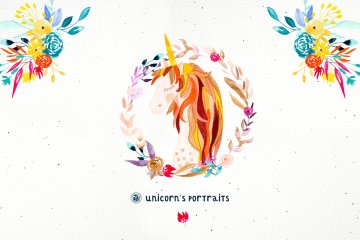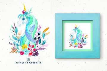 独角兽的肖像鲜花水彩插画Unicorn\'s Portrait