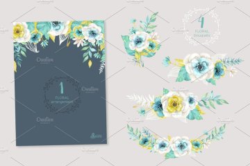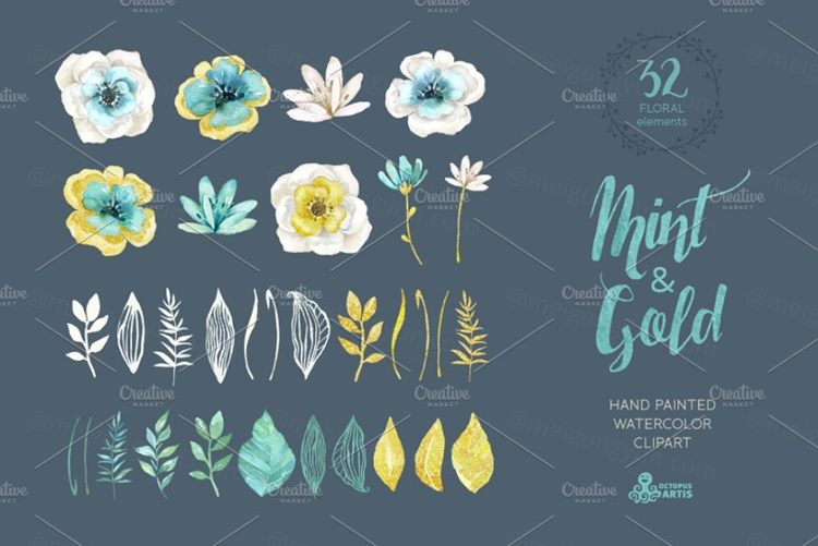 图穷联素材库 » 高品质手绘水彩花束元素剪贴画 Mint Gold Flow