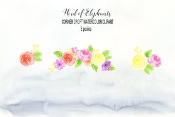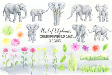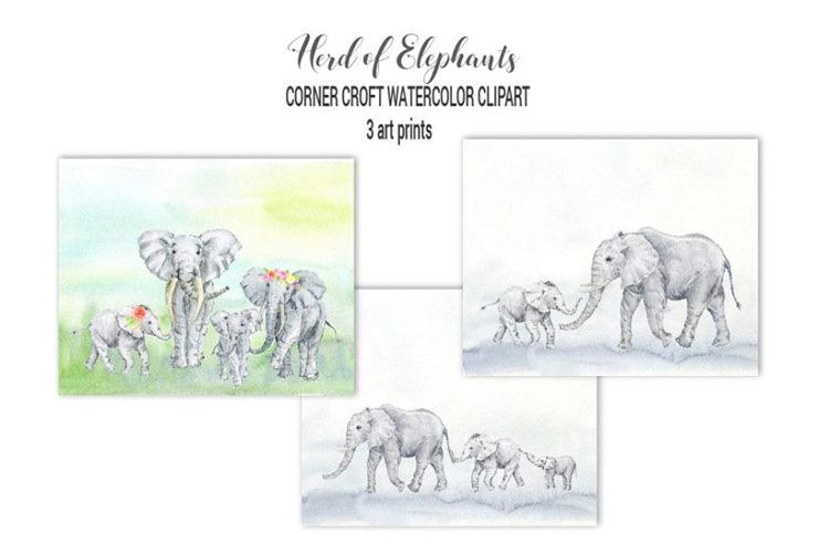图穷联素材库 » 手绘灰白色大象插图 Watercolor Herd of E