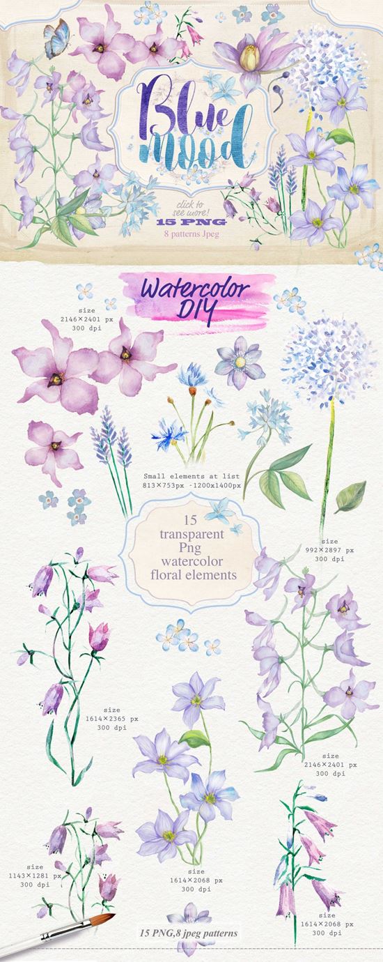 图穷联素材库 » 蓝色手绘水彩花卉插画素材合集 Floral collecti