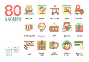 80个复古风格电子商务零售购物物流运输矢量图标集E-Commerce Retro