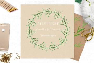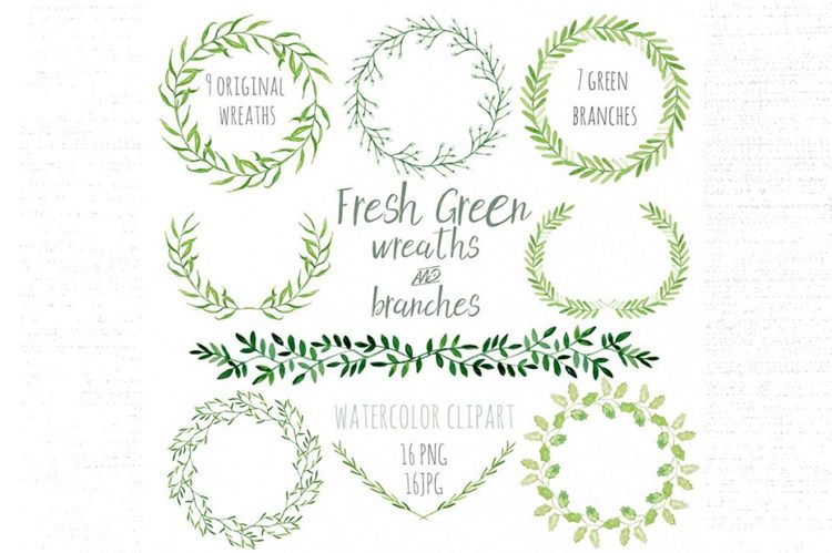 图穷联素材库 » 新鲜淡绿色手绘树枝花环剪贴画合集 Fresh green b