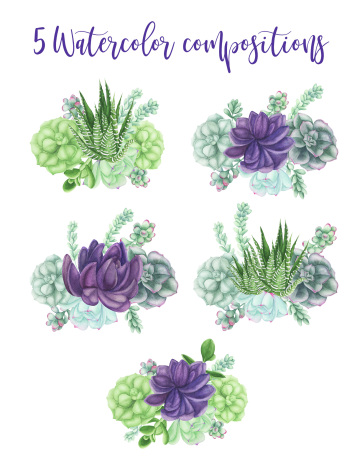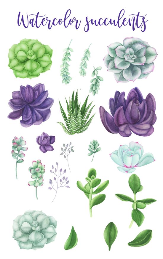 37 PNG和10 psd格式,300 dpi,透明背景。包括美丽的绿色和紫色色调的多肉植物。图形是高分辨率的,非常适合数字和印刷使用。