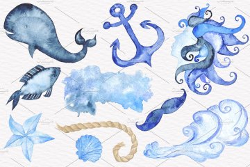 图穷联素材库 » 高质量水彩手绘航海元素剪贴画 Nautical Waterc