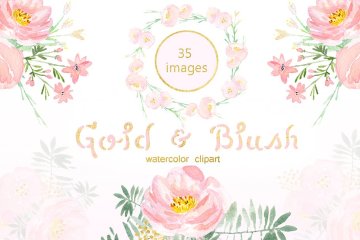 水彩浅粉腮红金色花卉剪贴画合集 Gold and blush