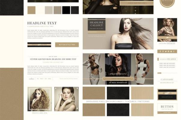 这款风格的盒子灵感来自于时尚和我之前发布的类似“风格套件”的重新设计。有许多金色调和细微的细节,投射出高端品牌。有一些漂亮的图案,如尘土飞扬的黑色皮革和金色细条纹上的金色。照片区域甚至设置了详细信息,如调整图层,以减少您的摄影饱和度,并为您的照片提供微妙的金色调。这种设计将成为一个非常时尚的品牌或网站,非常适合许多不同类型的企业或品牌。您必须具备足够的Photoshop知识才能调整此工具包以满足您自己的设计需求 - 因为它不是一个交钥匙解决方案,而是一组可用于快速启动您的创作过程的设计元素。