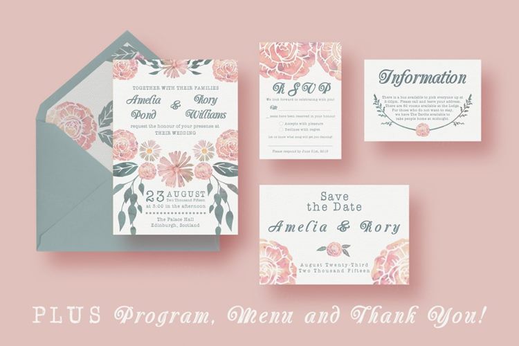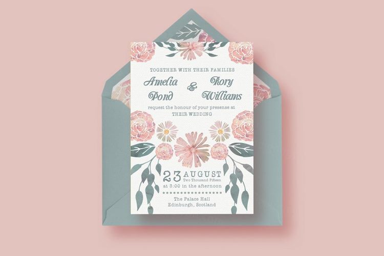 手绘水彩花卉装饰婚礼邀请函设计模板 Floral Water