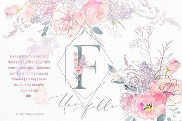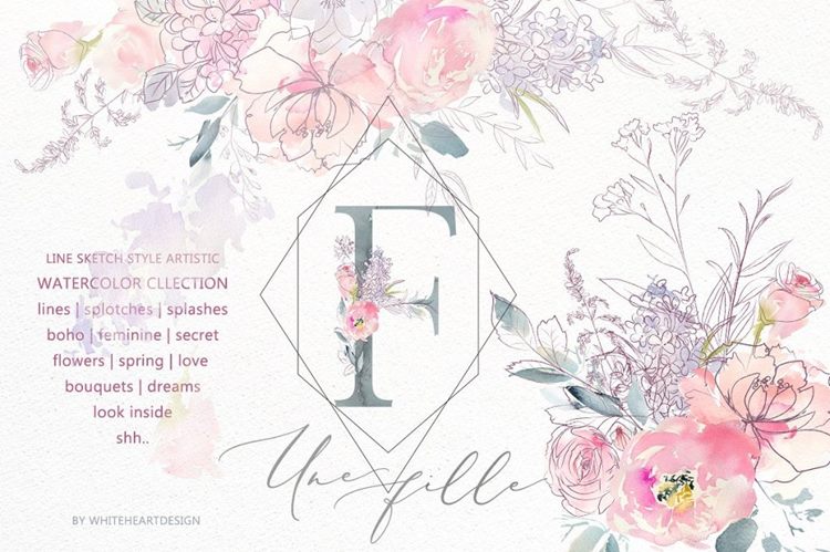 梦幻水彩花卉涂鸦线条素材包 Une Fille Waterc