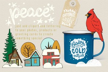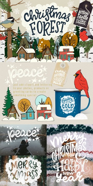 50个不同的手绘矢量剪贴画元素圣诞森林集合Christmas
