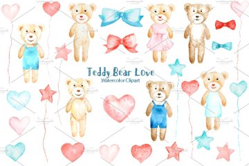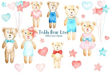 水彩泰迪熊爱心剪贴画 Watercolor Clipart