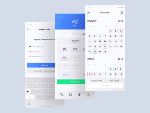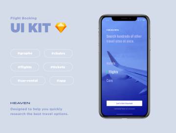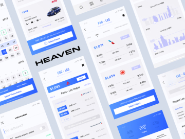 图穷联素材库 » 旅行度假机票出租车预订叫车服务航班查询移动APP UI套件Heaven Mobi
