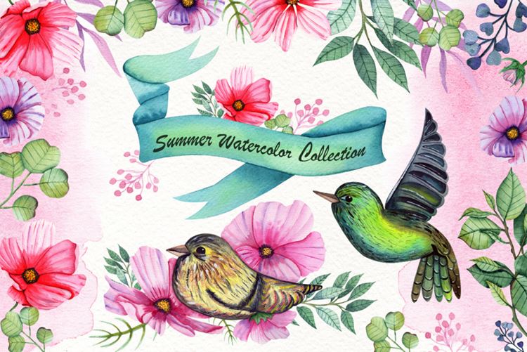 夏日手绘花鸟系列剪贴画素材合集 Watercolor Sum