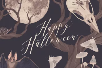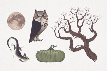 获取最怪异和神秘的插图,作为包括树、蝙蝠、蜥蜴和更多的美学图形元素创建!以最初的解释呈现万圣节的气氛。