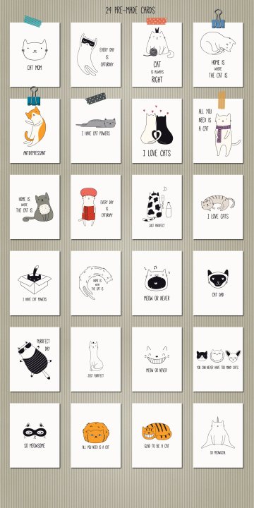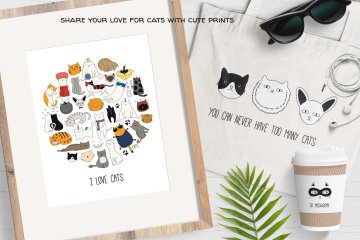 我为所有爱猫人士设计了这个涂鸦套装。通过此设置,您可以与世界分享您的爱!结合图像和报价使对毛茸茸的朋友充满热情的设计,然后将它们打印在所有内容上-卡片,海报,T恤,衣服,杯子,包,电话盒,文具,墙壁艺术品-您可以命名或装饰您的博客,网站或社交媒体页面。您甚至可以纹身!