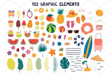 102个其他元素,包括冰淇淋,饮料,热带水果,棕榈叶,花朵,泳池浮标,贝壳,珊瑚礁鱼,蝴蝶等(AI,EPS10,具有透明背景的单独的高分辨率PNG)