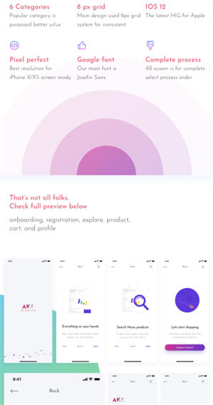 AKA UI Kit是电子商务商店鞋子应用程序。您只需点击一次即可在家中或任何地方使用您的应用投放。我们通过清晰的界面移动应用程序提供简单的订购和结账步骤。它包括36个有组织的屏幕和6个设计高品质和现代风格的类别。基于iphone x HIG的模板,用于更好的ui和ux用户。使用的图标和插图仅用于预览目的,虽然不包括在内,但它们是免费使用的 - 包含在zip文件中的链接