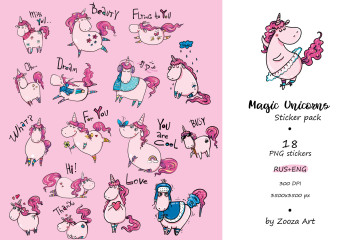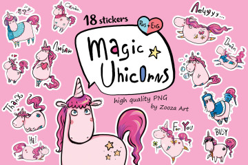 18个全新收藏的酷独角兽-超级可爱的信使和印花贴纸包!使用明亮的插图进行按摩,T恤,书籍插图,网页设计,杯子和其他物品。他们会表达您想要的一切!
