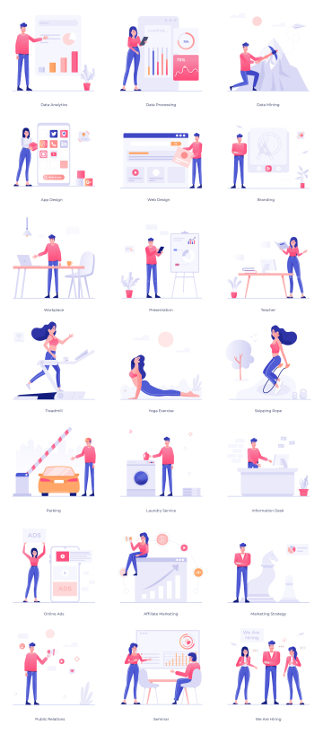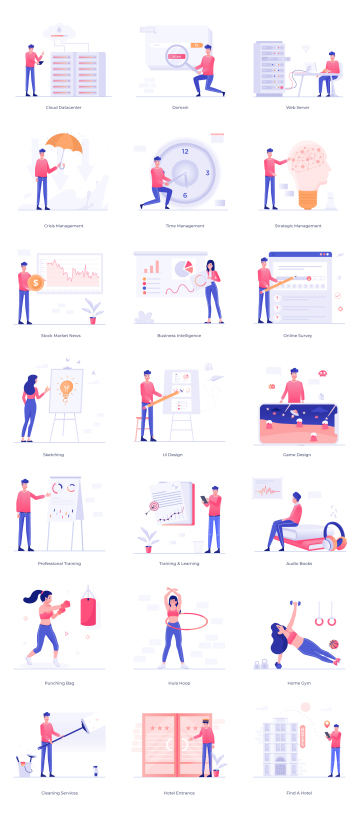 为您提供完整的平面插图包,为超过108种插图设计提供点缀。因此,创建轻松的艺术品并将其用于您的自定义Web和移动项目中。