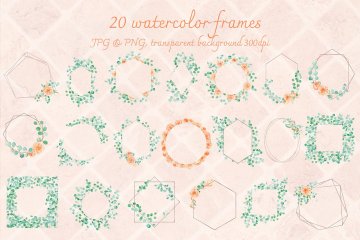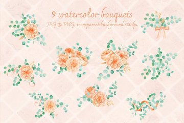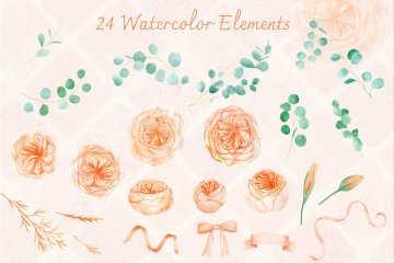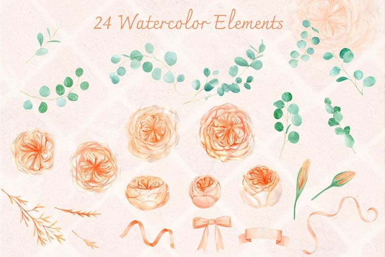 我很高兴向您介绍我的新水彩画套装,其中包括桉树和桃红色的英国玫瑰。这套包含80多种元素:水彩剪贴画,数码纸,花束,框架,花圈和水彩背景