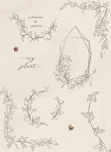 优雅的线描精美的常春藤植物花卉框架和花圈插图集,包括9个元素和1个无缝模式 简单干净的设