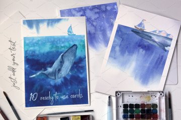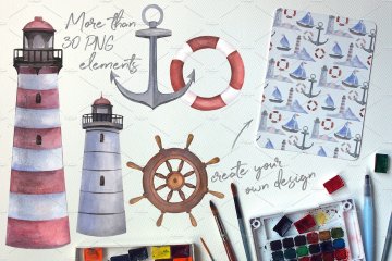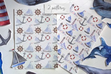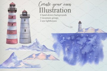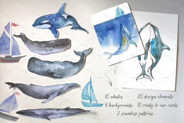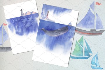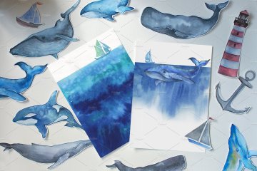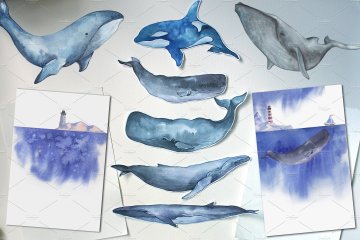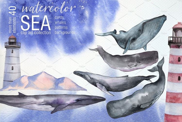 图穷联素材库 » 手绘水彩海洋鲸鱼灯塔剪贴画素材集 Watercolor Se