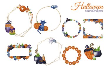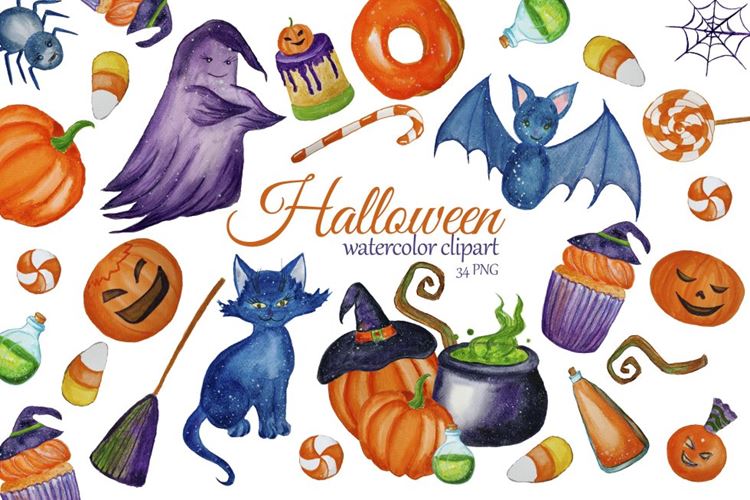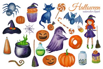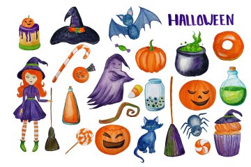 图穷联素材库 » 万圣节可爱小女巫猫蝙蝠糖果等元素水彩剪贴画 Watercol