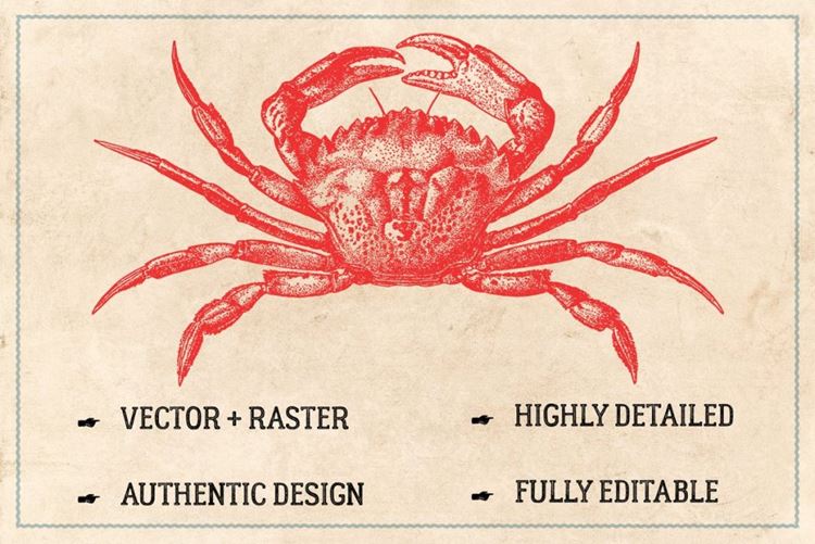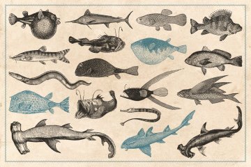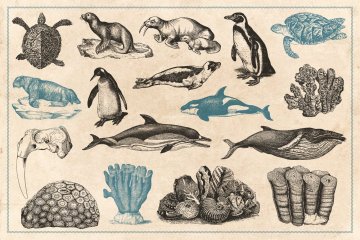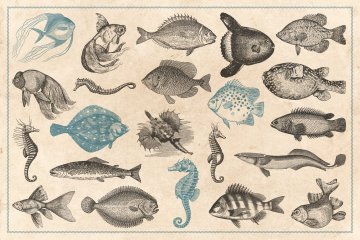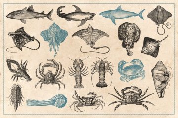 这套包含154张复古版画和鱼类,贝壳,海洋生物和珊瑚的手绘插图。它们已从许多旧书中进行了挽救,经过仔细地数字化,改进并变成了可缩放的矢量图形。其中大多数都非常详细,非常适合徽标设计和品牌目的,图案,海报,文具以及您能想到的所有其他内容。您可以根据需要自由缩放和重新着色。