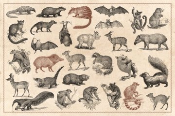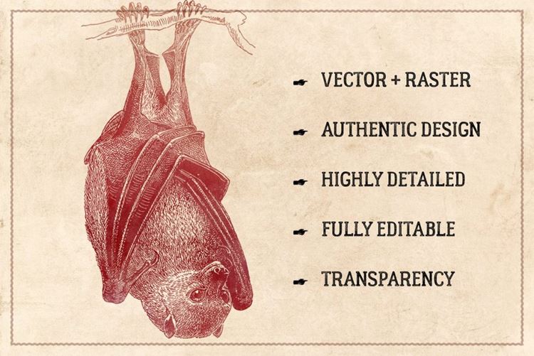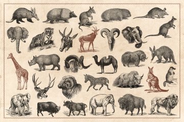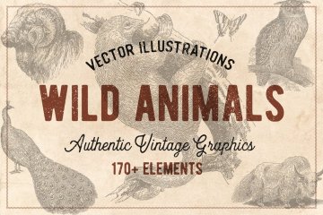 这套包含176张复古版画和手绘插图的野生动物,爬行动物,鸟类,昆虫和蜘蛛。它们已从许多古老的百科全书中被拯救出来,经过仔细地数字化,改进并变成了可缩放的矢量图形。其中大多数都非常详细,非常适合徽标设计和品牌目的,图案,海报,文具以及您能想到的所有其他内容。您可以根据需要自由缩放和重新着色。