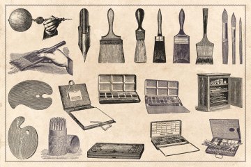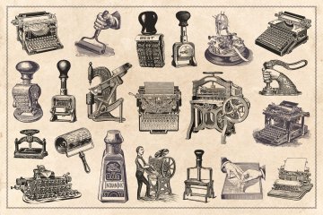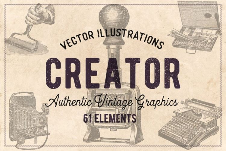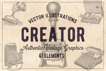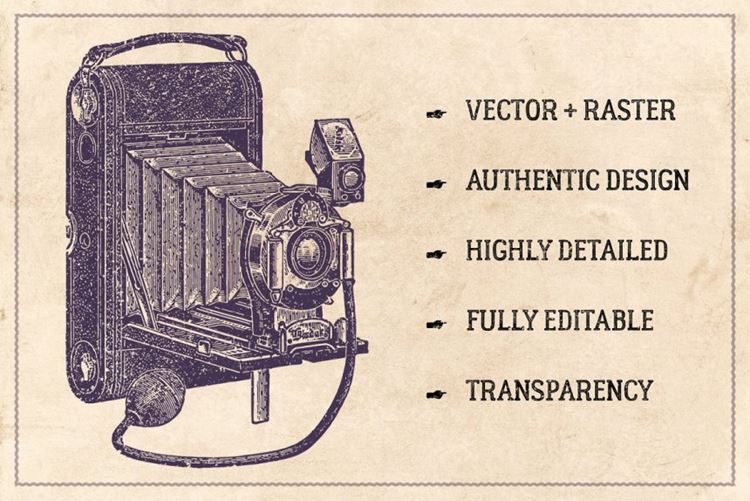 这套包含61个老式雕刻的相机,打字机,文具,印刷和绘图用品。它们已从许多旧书中进行了挽救,经过仔细地数字化,改进并变成了可缩放的矢量图形。其中大多数都非常详细,非常适合徽标设计和品牌目的,图案,海报,文具以及您能想到的所有其他内容。您可以根据需要自由缩放和重新着色。