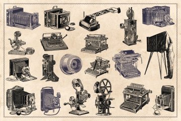 图穷联素材库 » 61幅手绘复古老式相机打字机文具等印刷绘图用品矢量插画 Vi