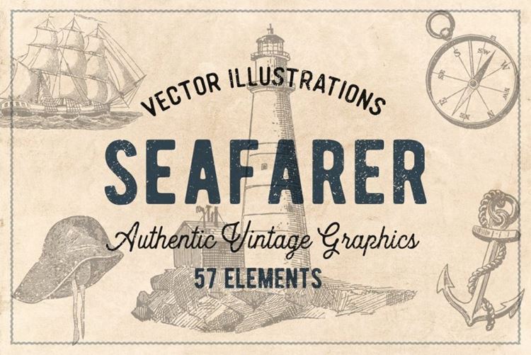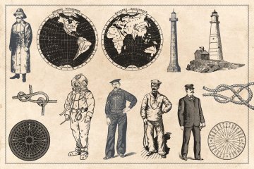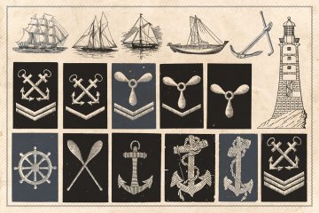 这套包含57幅复古版画和手绘航海插图。它们已从许多旧书中进行了挽救,经过仔细地数字化,改进并变成了可缩放的矢量图形。其中大多数都非常详细,非常适合徽标设计和品牌目的,图案,海报,文具以及您能想到的所有其他内容。您可以根据需要自由缩放和重新着色。