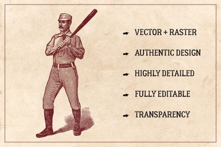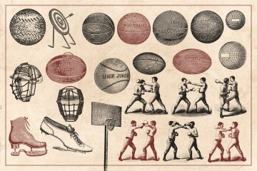 这套作品包含42种复古运动版画和手绘插图。它们已从许多旧书中进行了挽救,经过仔细地数字化,改进并变成了可缩放的矢量图形。其中大多数都非常详细,非常适合徽标设计和品牌目的,图案,海报,文具以及您能想到的所有其他内容。您可以根据需要自由缩放和重新着色。