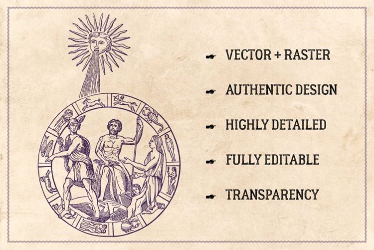 这套包含190个复古雕刻和炼金术,占星术,天文学和手相术项目的手绘插图。它们已从许多旧书中进行了挽救,经过仔细地数字化,改进并变成了可缩放的矢量图形。其中大多数都非常详细,非常适合徽标设计和品牌目的,图案,海报,文具以及您能想到的所有其他内容。您可以根据需要自由缩放和重新着色。