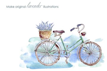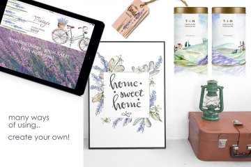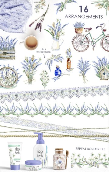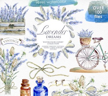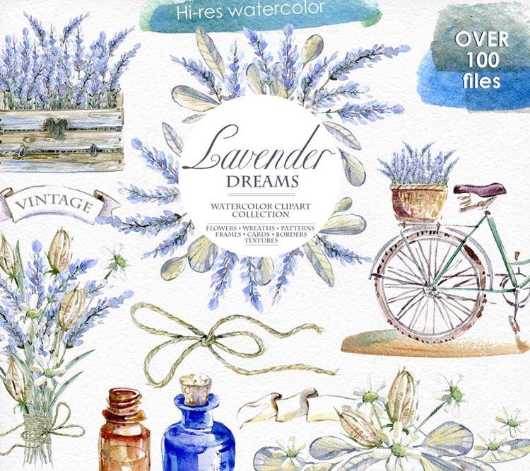 薰衣草水彩剪贴画集是手绘复古风格的薰衣草花的大集合,花束,花环和框架等不同的成分,老式气息的东西(自行车,木箱,水罐,鸟舍……)灵感来自普罗旺斯自然,内饰和新鲜的薰衣草空气。非常适合优雅婚礼设计,数字项目,网站,剪贴簿,纺织品设计和其他项目。