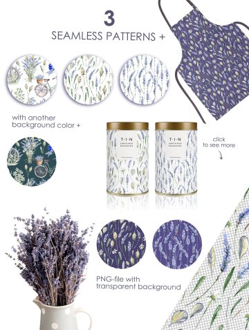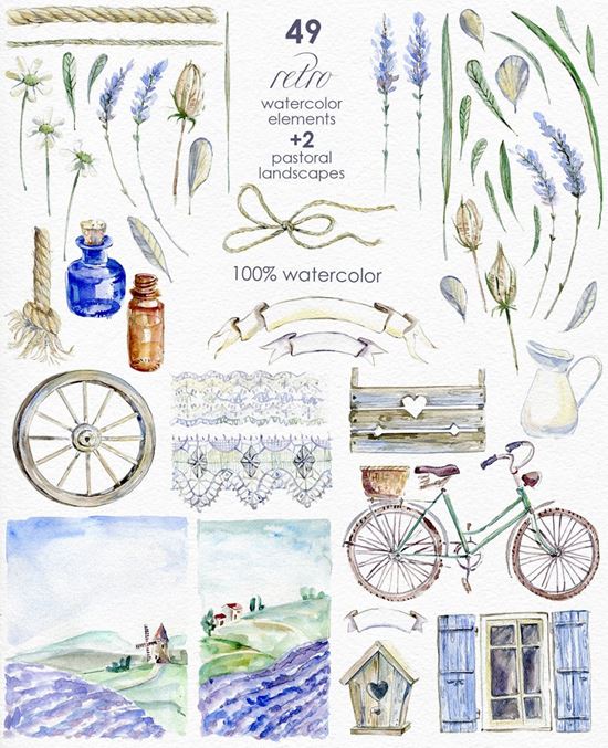 超过50种不同的水彩对象(薰衣草花,叶,洋甘菊,自行车,花边,鸟笼和其他+ 2种田园Landskapes)