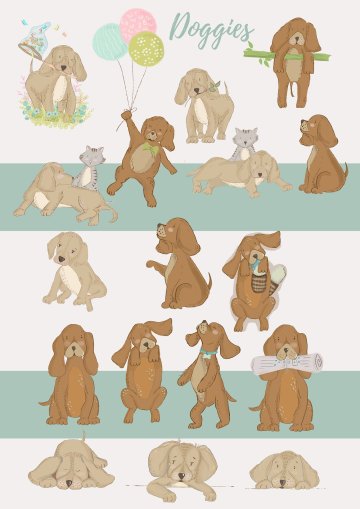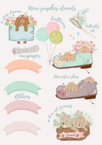 18 x狗狗插图10 x框架5 x预制花束1 x报纸1 x狗狗盒子2 x装饰鞋4 x丝带26 x单花1 x蝴蝶网26 x单叶4 x边框1 x狗形气球