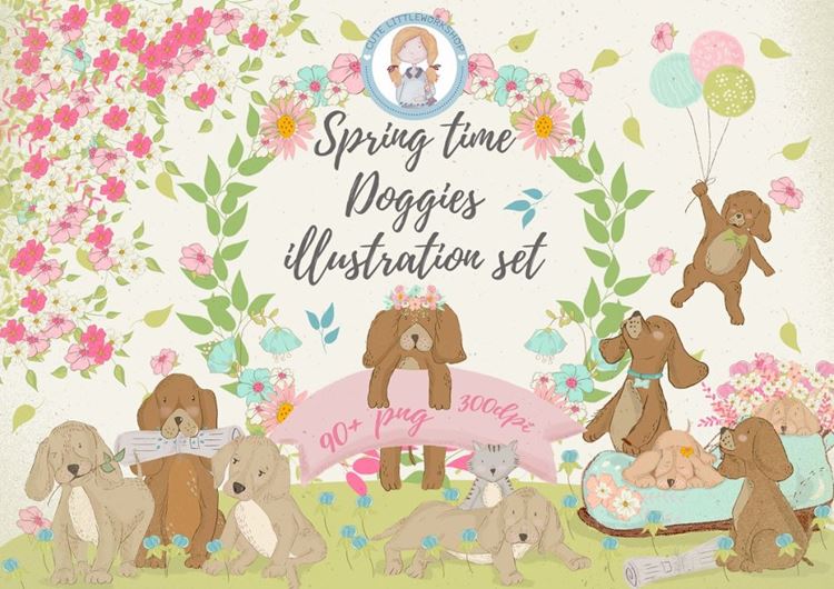 因为春天带有色彩,花朵,幸福和户外乐趣,所以这里是这款可爱的小狗套装,上面装有花框,树叶等,可以尽情享受设计。