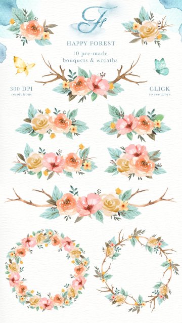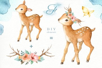 高质量的手绘水彩林地动物和花朵图像集。该套件中包括鹿,兔子,鸟,松鼠和其他动物插图。包括10个美丽的花束和花圈安排。完美的婚礼请柬,贺卡,报价,海报,徽标,博客和DIY。