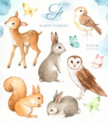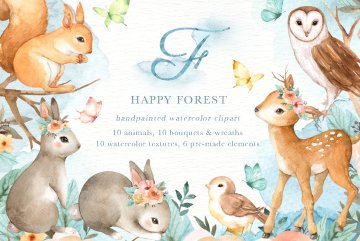 水彩手绘快乐森林动物花朵剪贴画素材 Happy Forest