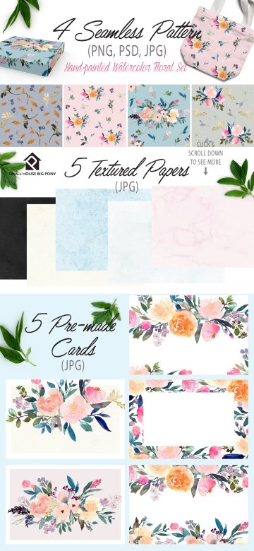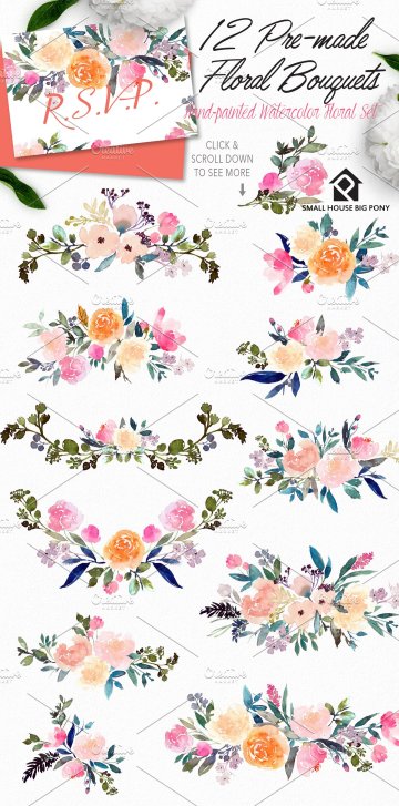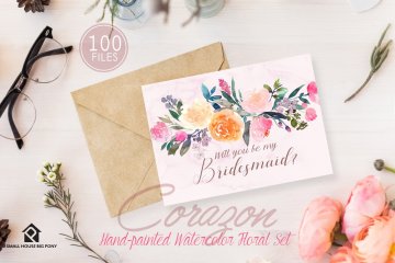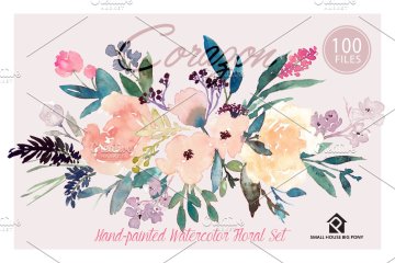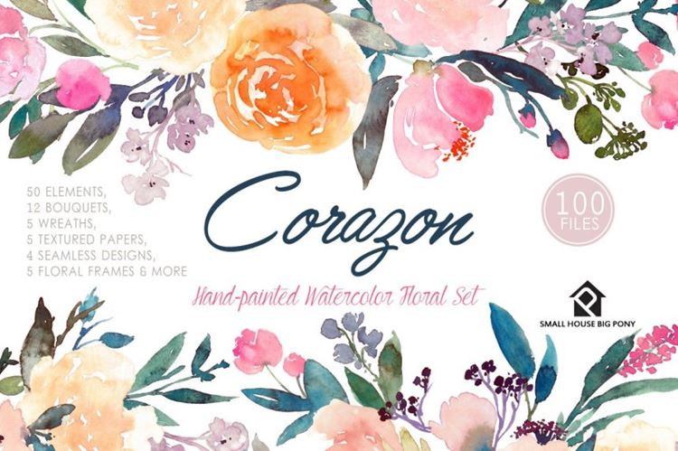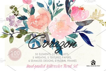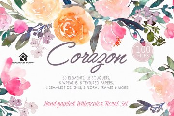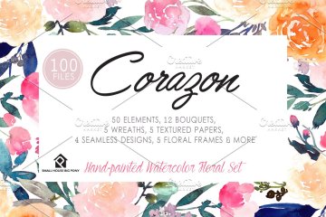 Corazon-手绘水彩花卉套装 这是一组水彩花卉设计,可以轻松地与协调的颜色组合在一起,包括浅粉彩,桃红色,粉红色,靛蓝和暗色调叶绿色。这是一整套具有即用型花束,花圈,横幅,美纹纸和无缝图案的套件。还包括50个独立的元素,您可以玩这些元素来制作自己的花卉设计。