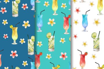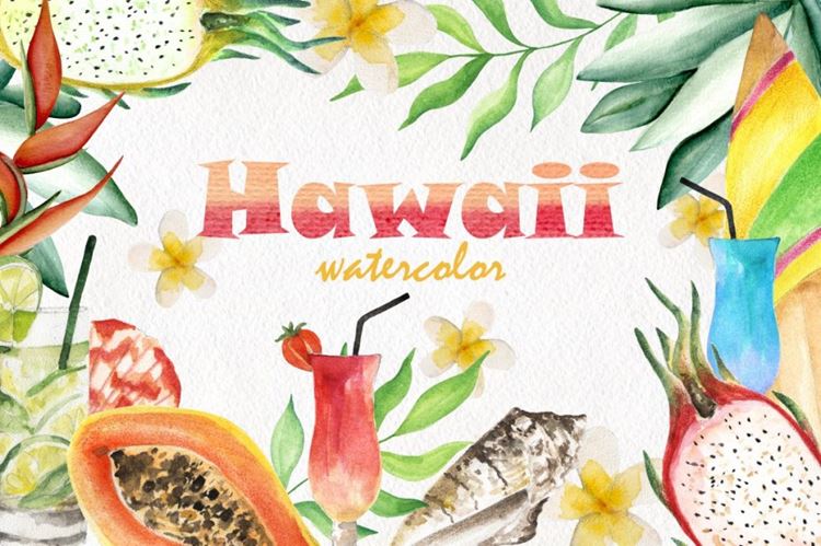 水彩手绘夏威夷热带冲浪鲜花鸡尾酒等夏季元素 Hawaii.