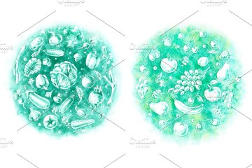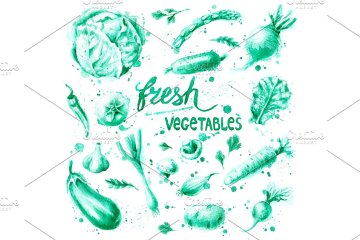 绿色单色插图,其中包含新鲜蔬菜(jpg 5000px X 5000px),不同水果(jpg 3560px X 3560px)和蔬菜(jpg 3750px X 3770px)。