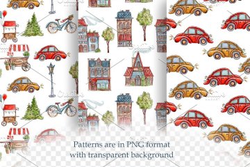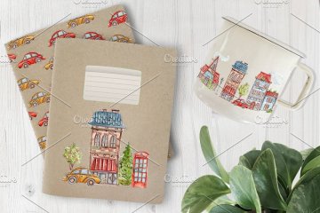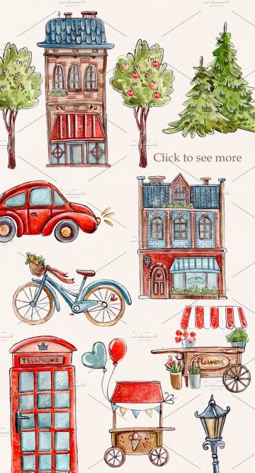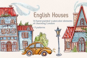 图穷联素材库 » 英式小镇房屋自行车冰淇淋小汽车装饰水彩手绘剪贴画 Engli