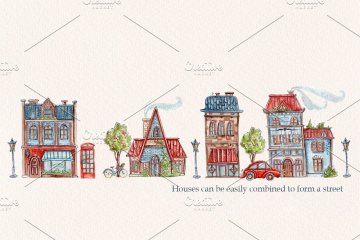 英式房屋手绘水彩元素集。这些元素可以完美地用于贺卡,礼品包装纸,童装,床上用品,纺织品,文具,笔记本,电话盒和许多其他东西。