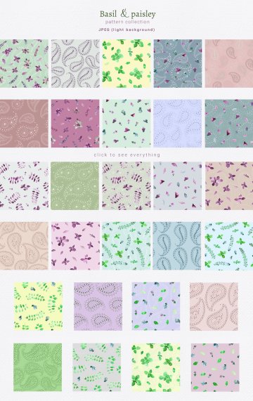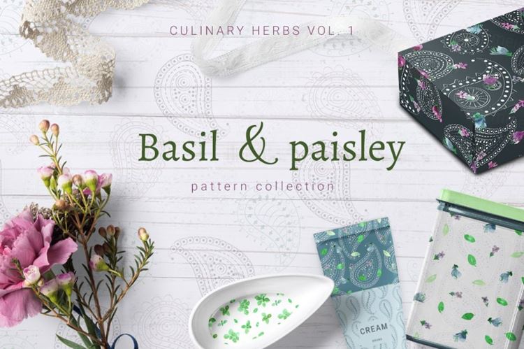 现代手绘草本植物花卉无缝图案素材 Basil paisle
