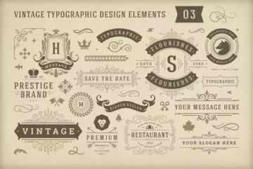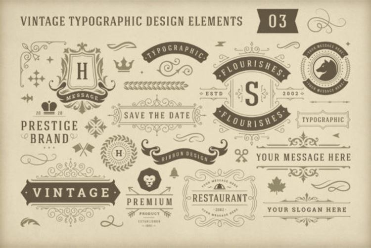 复古老式版式设计元素图形插画素材,包含标签和徽章、复古丝带、豪华华丽的徽标符号、装饰小插图等。适用于徽标、结婚请柬、书籍封面、证书、标牌、海报、贺卡、社交媒体帖子、印刷或数字广告、剪贴簿等。易于修改,可编辑文本,调整大小和更改颜色,100%在Photoshop和Illustrator中可编辑的矢量形状。