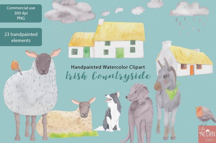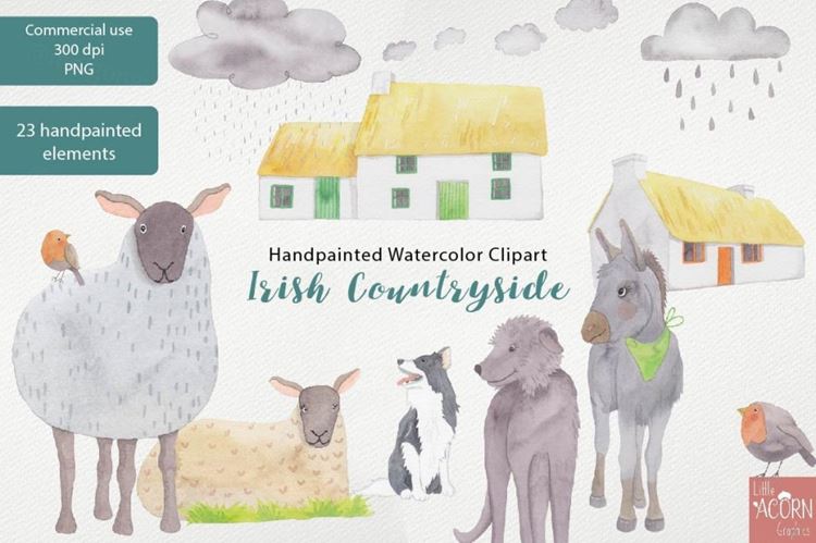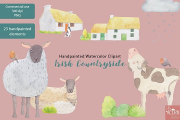 爱尔兰水彩手绘农场动物剪贴画素材 Irish Country